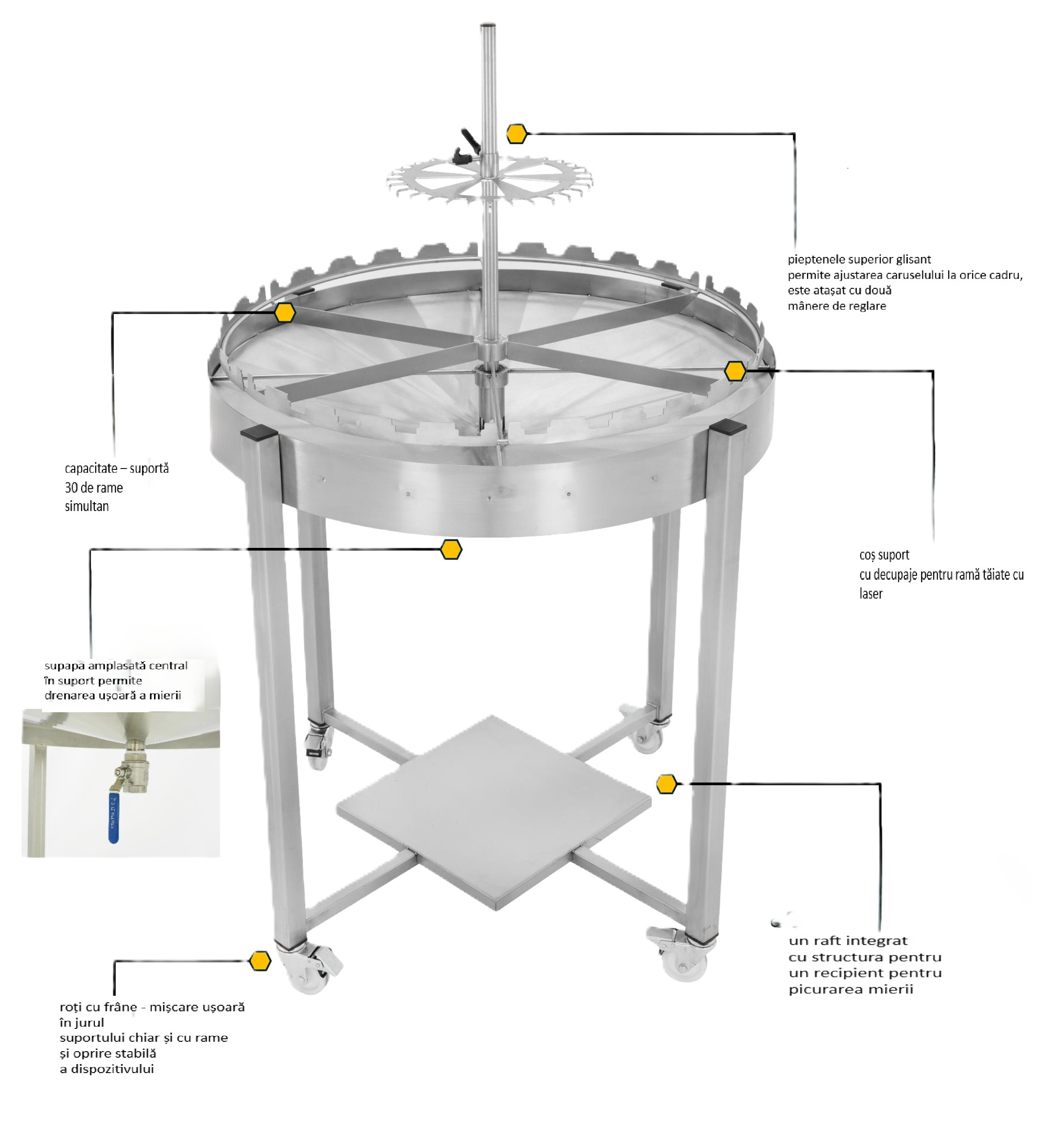 Suportul cadru a fost conceput având în vedere stabilitatea și durabilitatea, asigurând depozitarea în siguranță a ramelor pentru albine . Construcția sa solidă și picioarele reglabile permit amplasarea pe orice suprafață. În plus, picioarele special concepute permit plasarea unei găleți sub carusel, facilitând colectarea mierii care picură de pe rame.